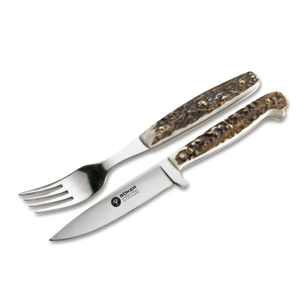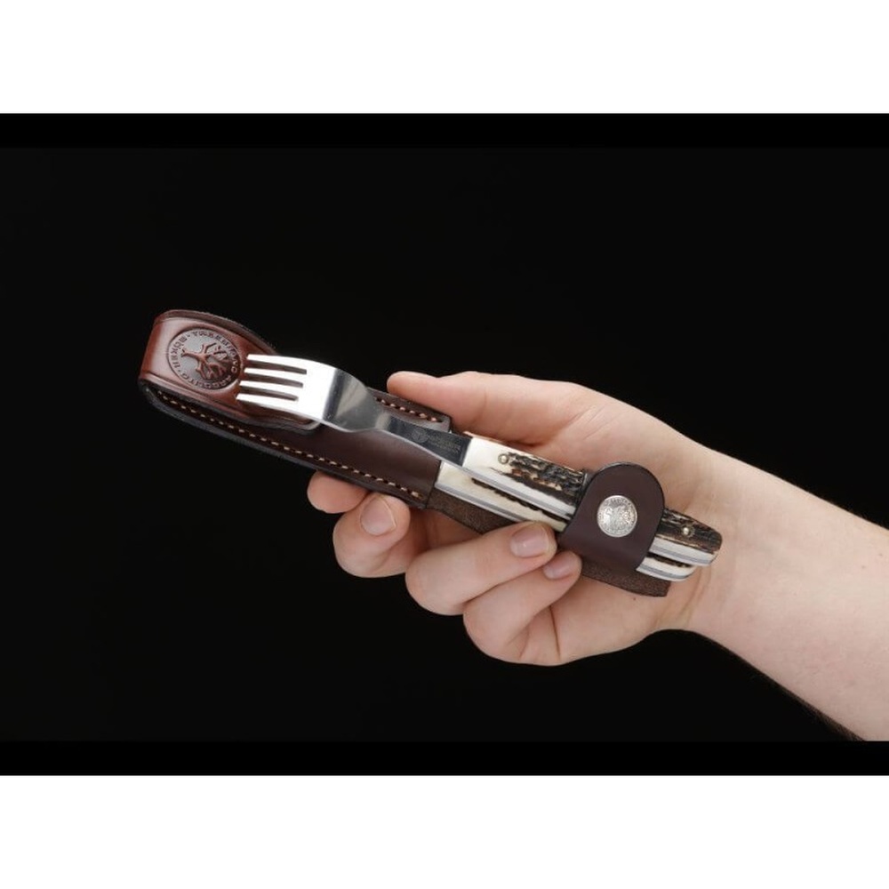 Sin duda que la tradición nacional de organizar reuniones alrededor de un asado es de eterna vigencia. Es por ello que prestamos mucha atención a la fabricación de cubiertos especiales. Este juego es un ejemplo. Hoja de acero inoxidable 498 con defensa integrada. Empuñadura con cachas de madera de guayacán. Vaina de cuero que contiene el cuchillo y el tenedor, con pasacinto y broche de seguridad.